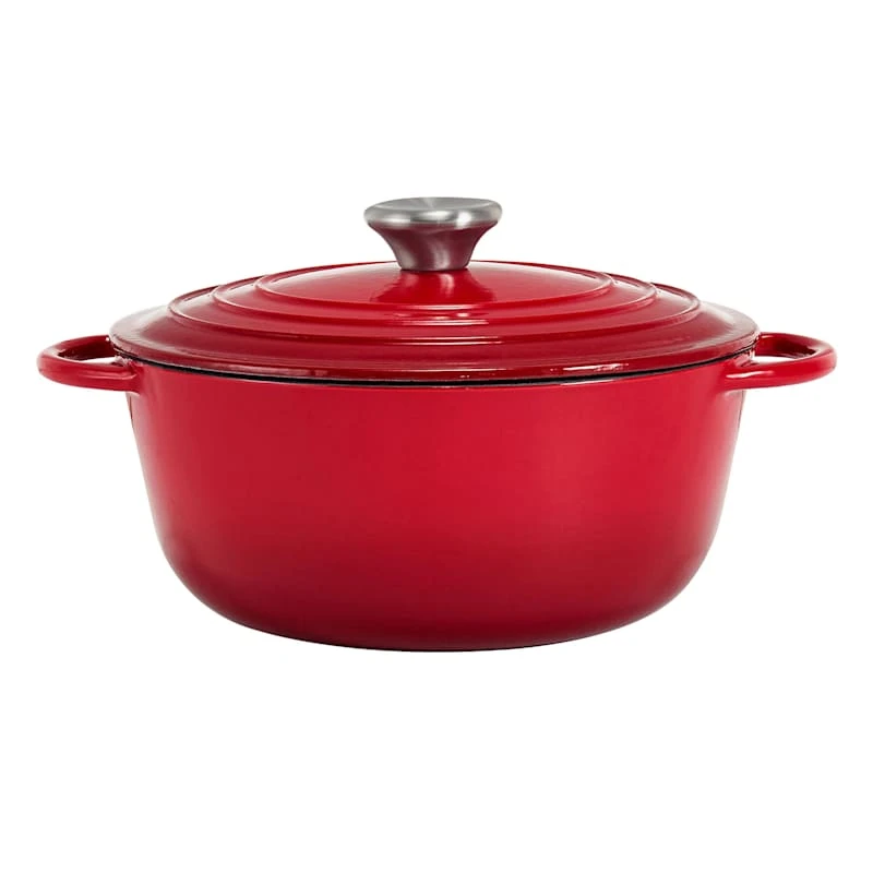 Our versatile 3.5qt. red Dutch oven is cast of solid iron and enameled to provide many years of cooking pleasure. Cast iron cookware is valued for its versatility on all cooking surfaces (flame, oven and electric) and its ability to retain heat and cook food evenly.