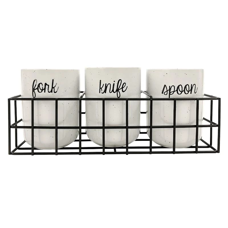 4-Piece Flatware Caddy Set White Cylinder Holder Black Metal Rack