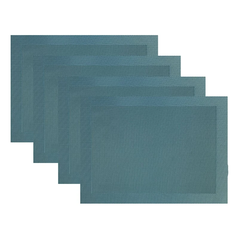 Laila Ali brings the mindset of a world-champion athlete and passion for healthy living to create a modern lifestyle collection with serious style found only At Home. Give your dining table a dash of drama with this teal border placemat set. Taking on a clean-lined rectangular silhouette, the placemats showcase a tonal bordered design that gives them personality. Their convenient vinyl construction allows for quick and easy cleaning after meals. A set of four, perfect for dinner parties and festive family feasts alike.