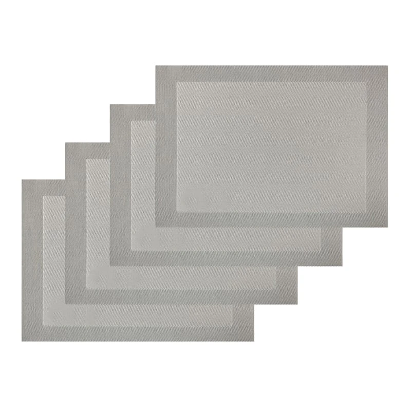 Laila Ali brings the mindset of a world-champion athlete and passion for healthy living to create a modern lifestyle collection with serious style found only At Home. Give your dining table a dash of drama with this silver bordered placemat set. Taking on a clean-lined rectangular silhouette, the placemats showcase a tonal border design that gives them personality. Their convenient vinyl construction allows for quick and easy cleaning after meals. A set of four, perfect for dinner parties and festive family feasts alike.