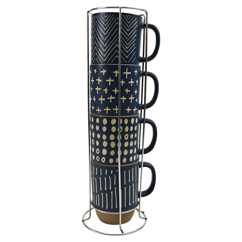 Set Of 4 Stacked Navy Blue Mugs, 14oz